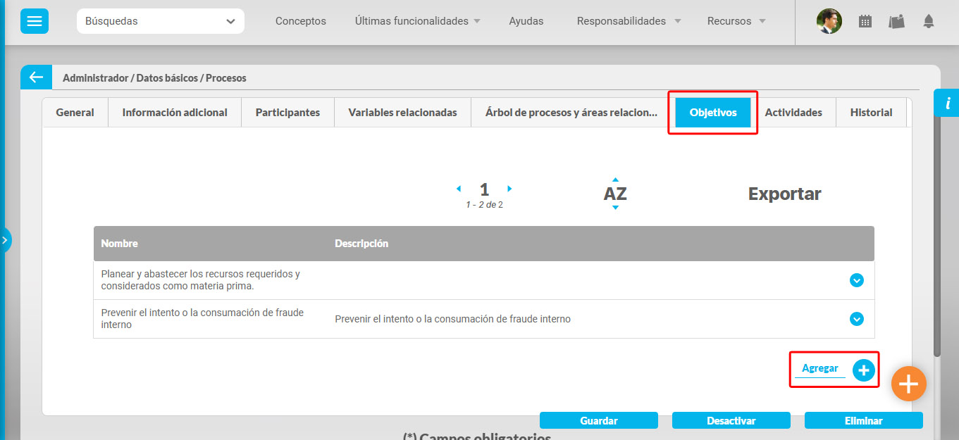 Una vez se encuentra en la pantalla de edición del proceso haga clic sobre el botón Agregar de la sección Objetivos.