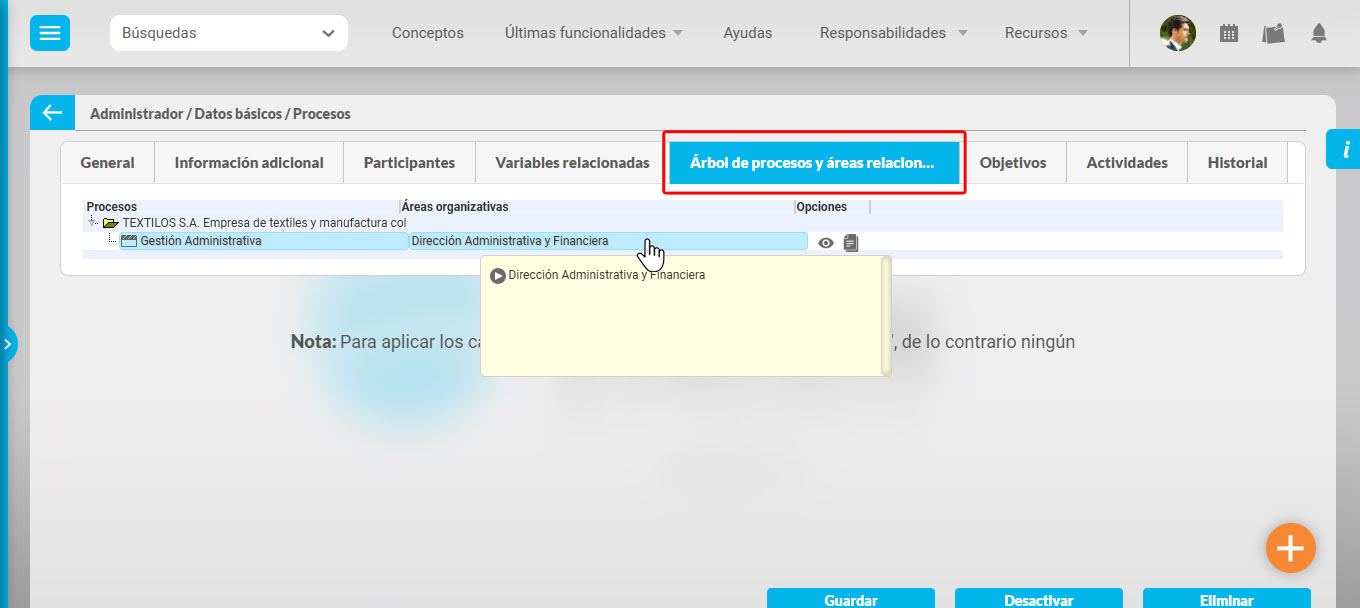 Desde esta pantalla puede agregar participantes, variables relacionadas, objetivos y actividades al proceso. En la sección de Árbol de procesos y áreas relacionadas, se puede visualizar las áreas asociadas al proceso.