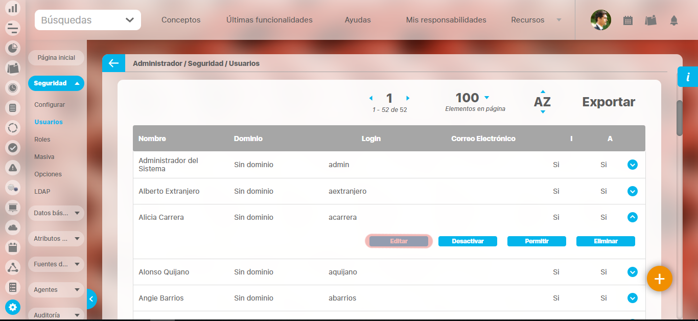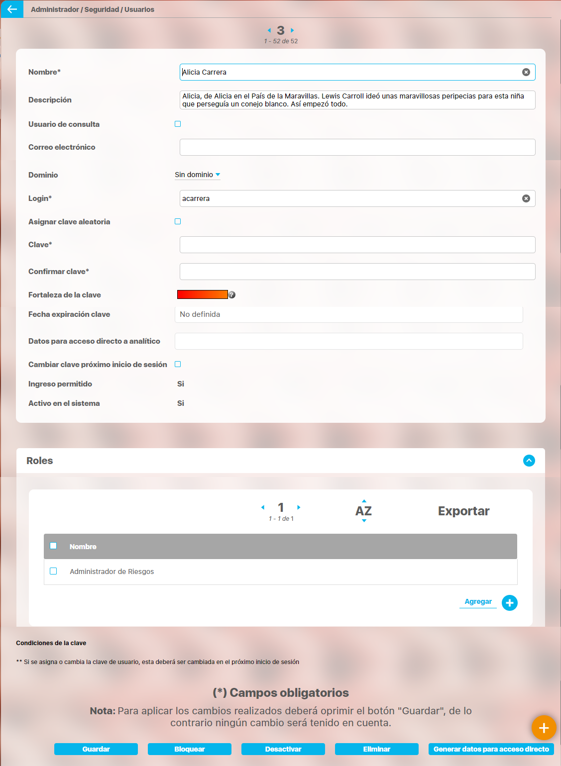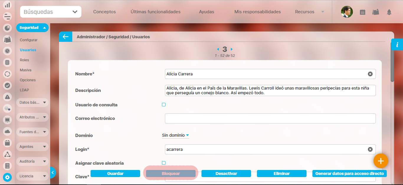 También puede realizar acciones sobre el usuario tales como eliminarlo, activar/inactivarlo y bloquear/bloquearlo.