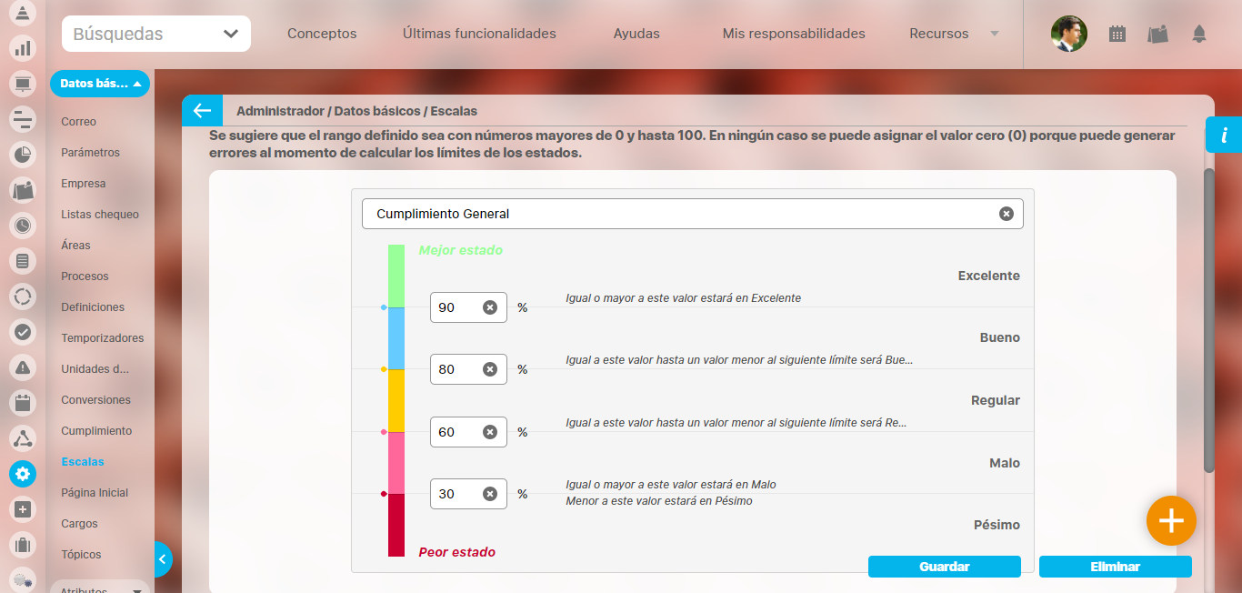Aparece la pantalla de edición de la escala con sus datos básicos, desde donde podrás realizar modificaciones. Una vez efectúes los cambios da clic en el botón Guardar, si cambias alguno de los valores de los límites de los estados y la escala no es usada por ningún indicador el sistema te mostrará un mensaje de operación exitosa,