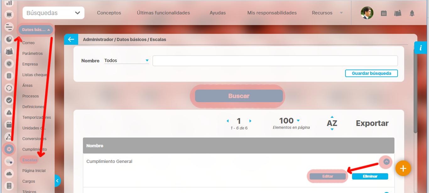 Para editar una escala, primero encuentra la escala sobre la cual deseas realizar dicha acción, una vez encuentres la escala despliega la flecha y selecciona la opción "Editar".