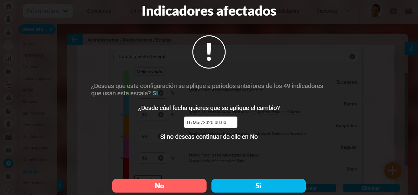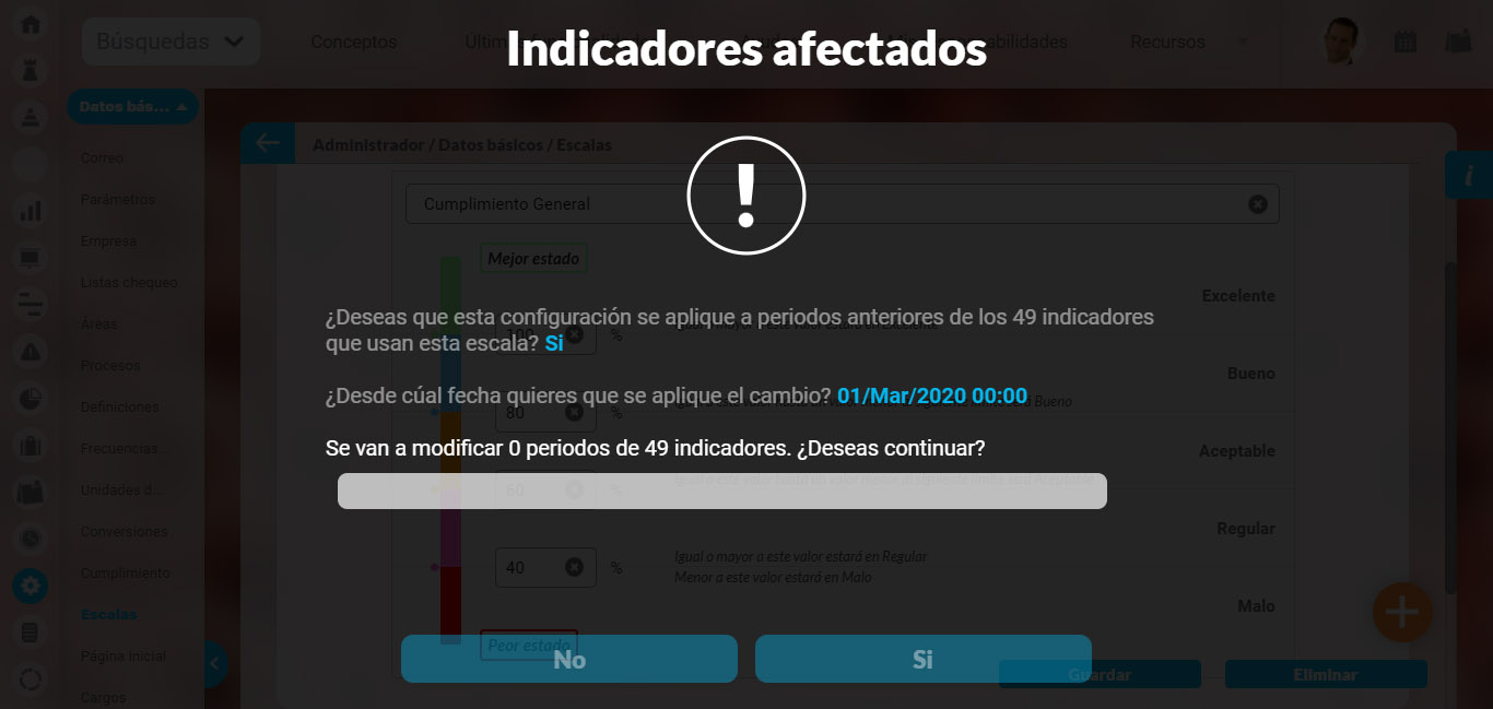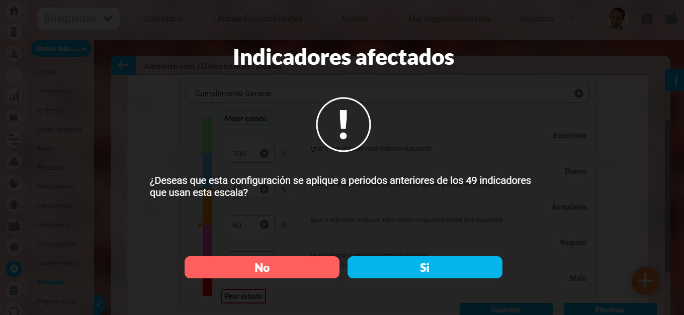 Si cambias alguno de los valores de los límites de los estados y la escala es usada por lo menos en un indicador con valores, el sistema te mostrará un mensaje de operación exitosa y luego te ofrecerá la oportunidad de aplicar el cambio a periodos anteriores mostrando cuántos indicadores se verán afectados.