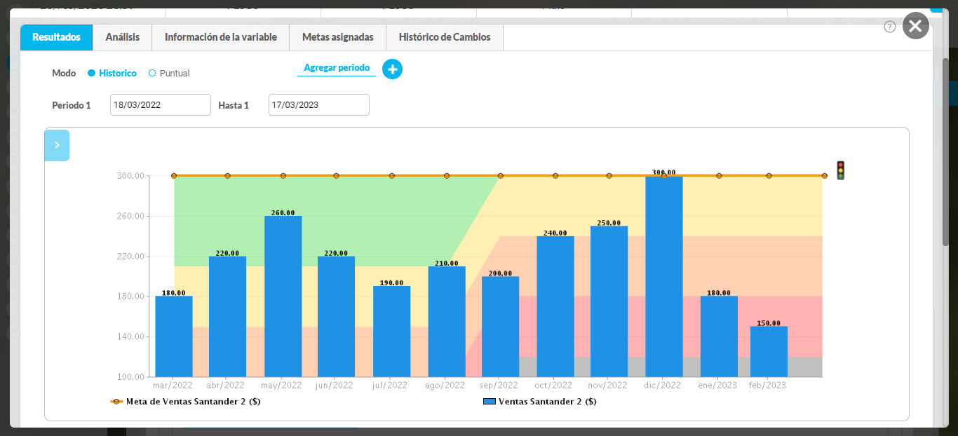 Al cambiar algunos de los valores límite de los estados y luego consultar las estadísticas históricas del indicador afectado, la gráfica se verá igual que antes hasta la fecha que se seleccionó al realizar el cambio de la escala y de ahí en adelante se verá con los nuevos valores de la escala. Por ejemplo en la siguiente imagen se cambiaron los valores de la escala desde Septiembre del 2022 por esta razón los colores del cumplimiento se ven mas arriba formando un escalón a partir de esta fecha.