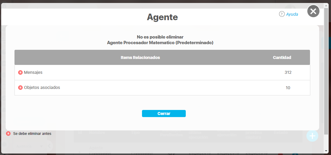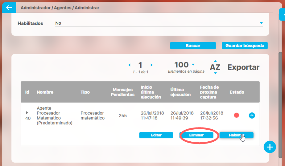 Si el rol al que perteneces tiene el permiso de administrar agentes podrás eliminarlos, esta acción la puedes realizar desde la pantalla de edición del agente o desde la pantalla de búsqueda.
