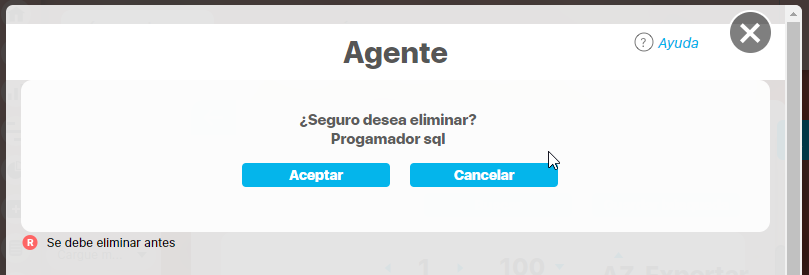 Busca el agente y has clic en Eliminar aparece un mensaje de confirmación de la eliminación. Si haces clic en Aceptar se elimina el agente. Si haces clic en cancelar o en volverás a la pantalla anterior sin eliminar el agente.