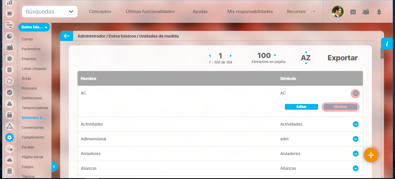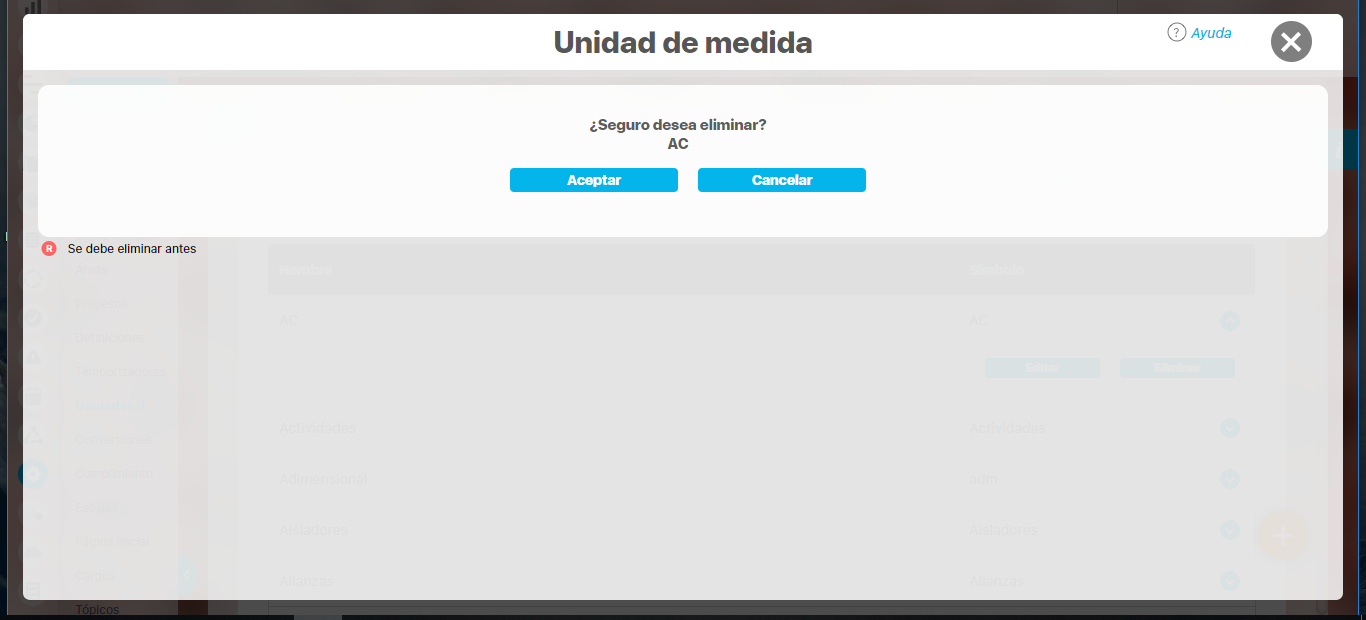 Una vez encuentra la unidad de medida haga clic sobre ésta y seleccione la opción "Eliminar".