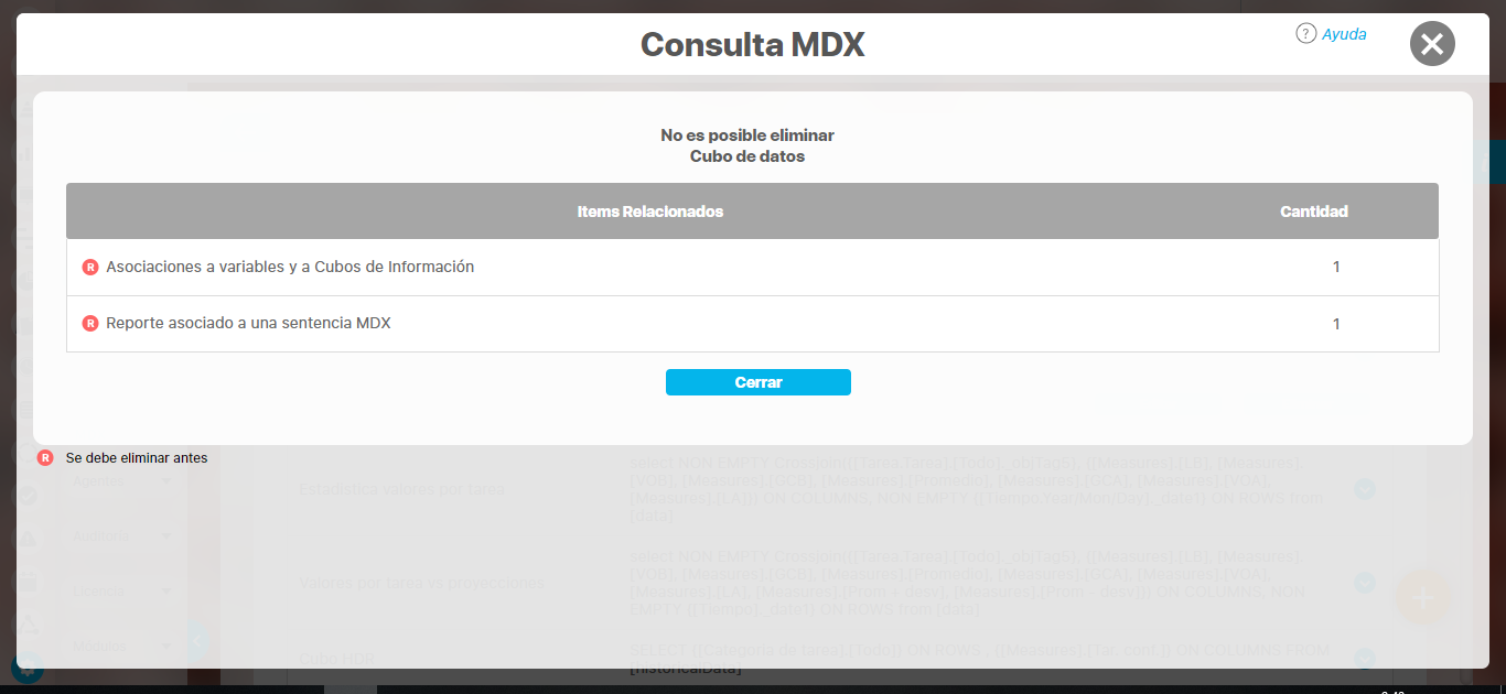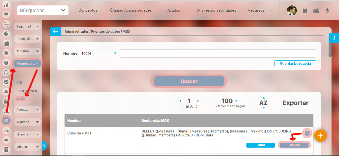 Encuentre la sentencia sobre la cual desea realizar dicha acción. . Para ello tenga en cuenta los parámetros de búsqueda expuestos en el ítem "Buscar consulta MDX".Una vez encuentra la sentencia haga clic sobre ésta y seleccione la opción "Eliminar".