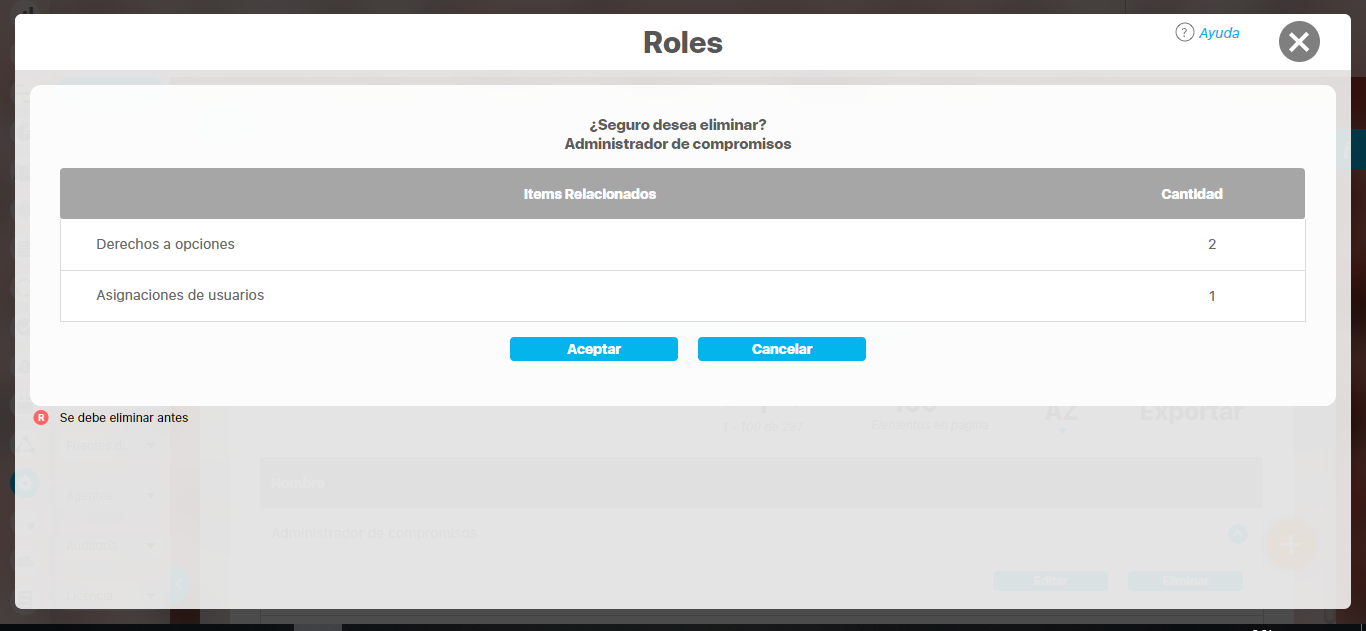Se pueden eliminar roles siempre y cuando no estén asociados a alguna opción de la Suite, de lo contrario solo podrá ser eliminado hasta que se remueva esa asociación.