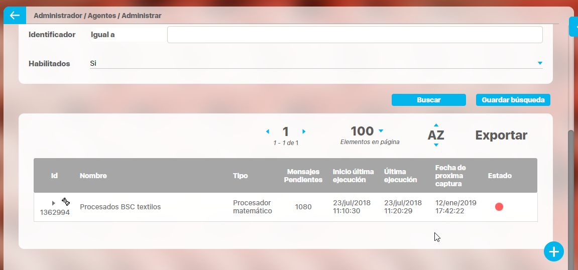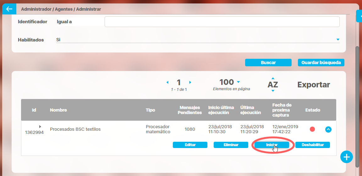 Has clic sobre Iniciar para que empiece la ejecución del agente. Al iniciar la ejecución la pantalla se recarga y muestra un reloj de arena girando para indicar que la ejecución se dio inicio.