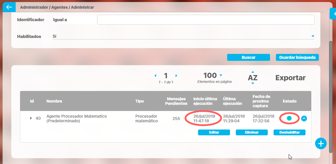 Al recargarse nuevamente la pantalla si aún el agente se está procesando verás la nueva fecha de inicio de ejecución con la fecha del momento actual, el estado en verde, la fecha de Ultima ejecución será la misma que había antes. Si ahora es la fecha de próxima captura entonces se actualizará con la fecha de próxima captura según su temporizador, sino lo es permanece igual.