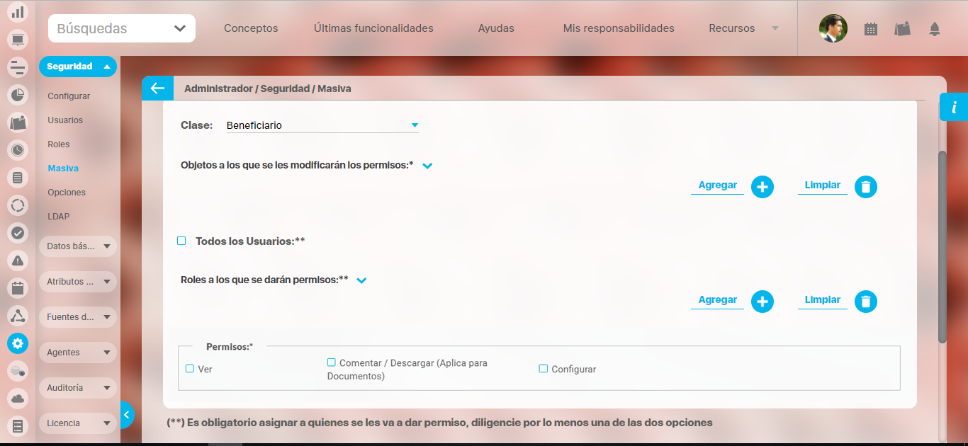 Permitirá al usuario Administrador del sistema, asignar seguridad de forma masiva a diferentes objetos configurados en la aplicación.