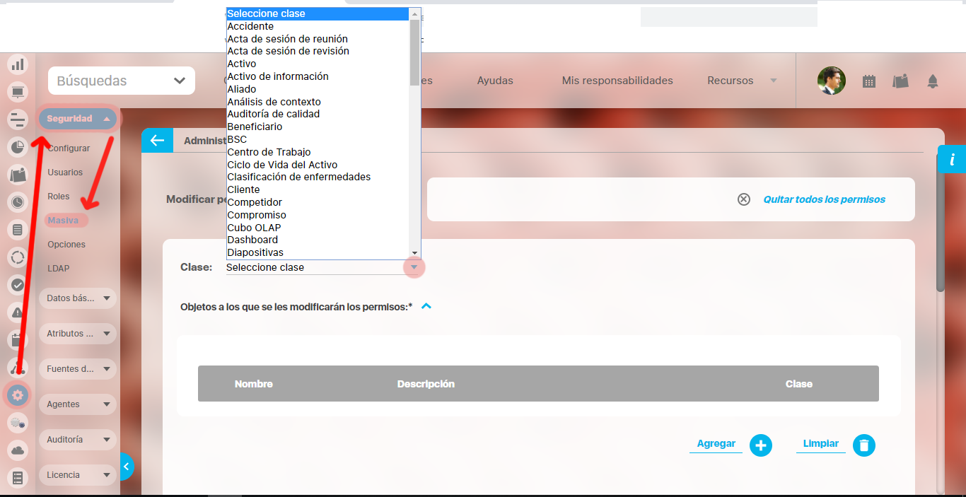 Seleccione la clase a la cual va a modificar los permisos. El listado de objetos a los que le podrá modificar los permisos son los siguientes:
