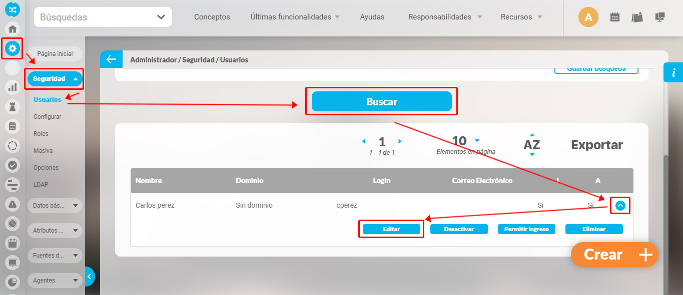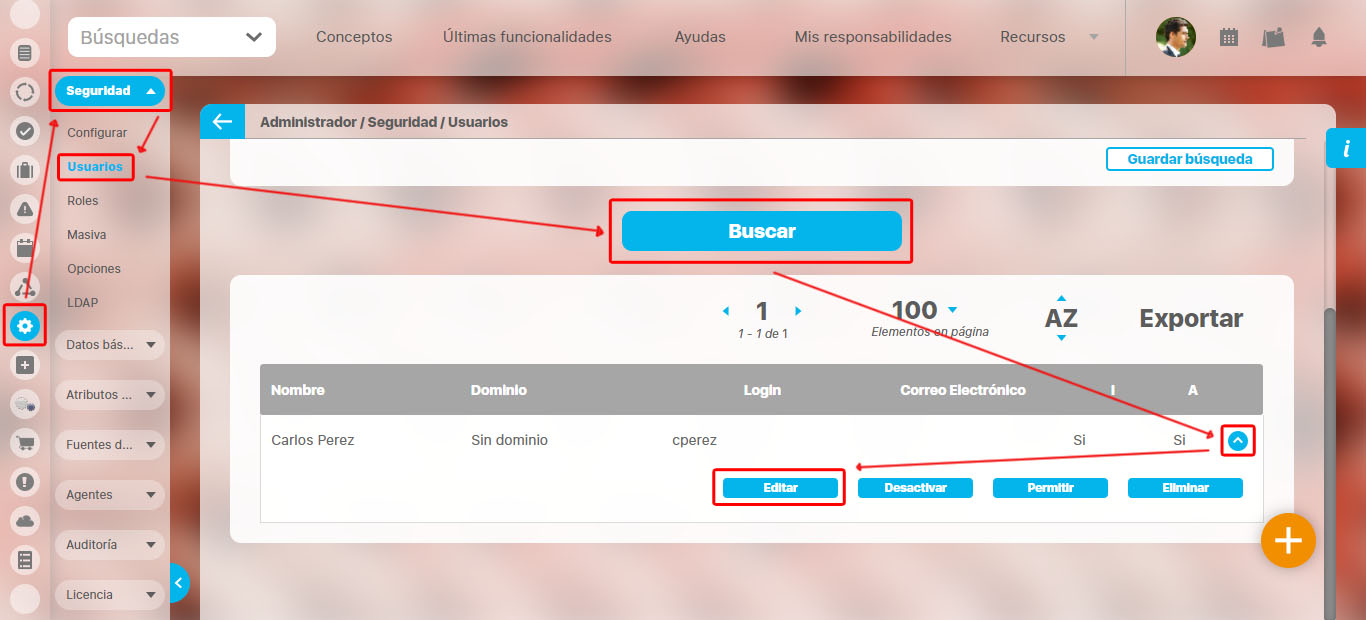 Inicialmente se debe buscar el usuario al que le vamos a quitar las responsabilidades y editarlo.