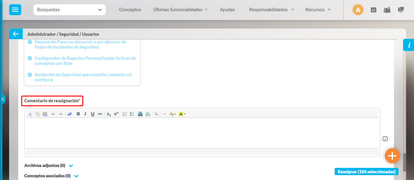 Si eres configurador del sistema o tienes permisos te aparecerá la opción de Reasignar responsabilidades. Esta opción será muy útil en los casos en que un usuario ya no labore en la organización, y se requiere que todas sus responsabilidades pendientes sean asignadas a otro usuario activo, o uno nuevo que se cree.