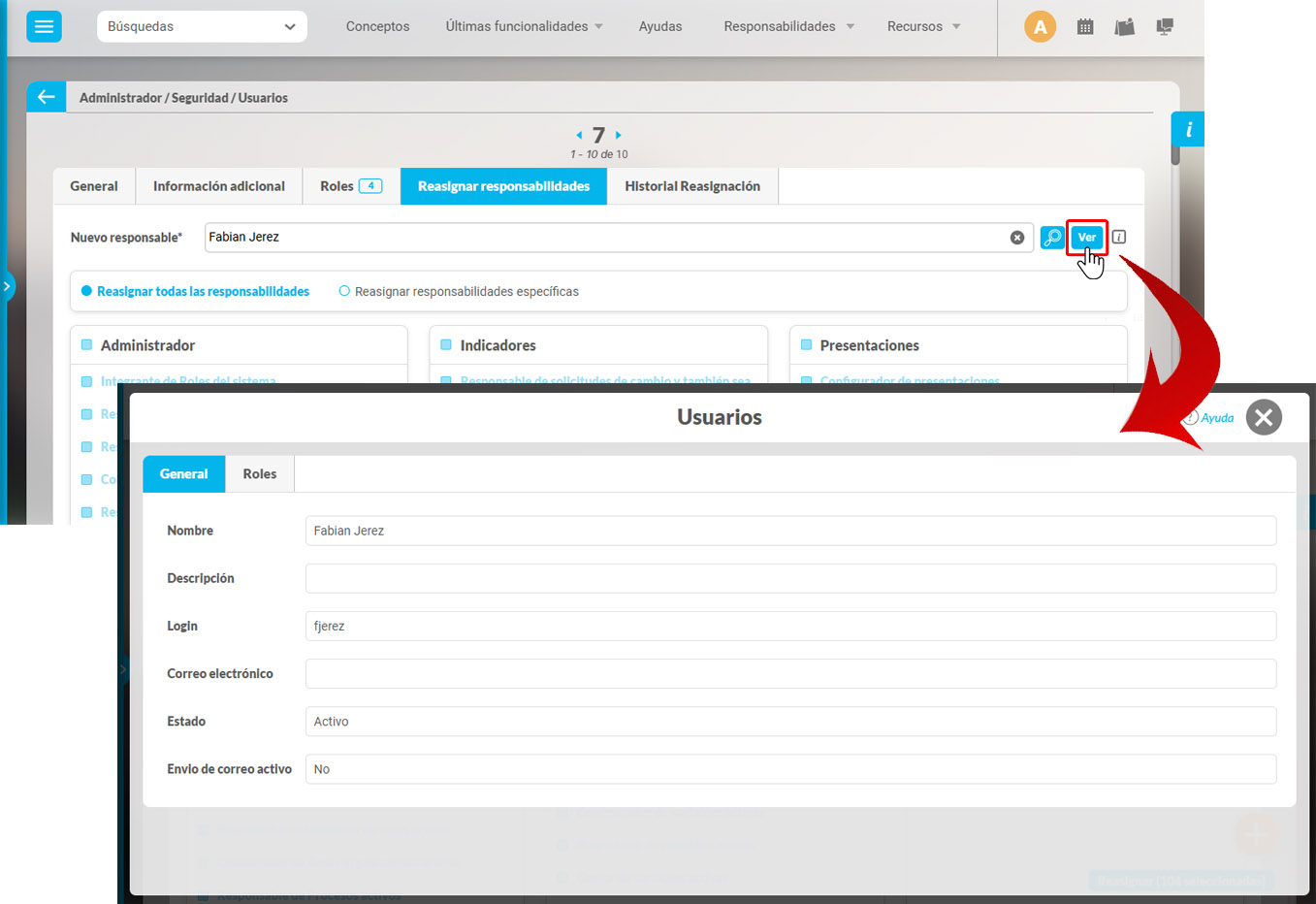Si das clic en el botón ver, te llevará a una pantalla emergente en donde puedes ver la información general y los roles del usuario al que se le asignarán las responsabilidades.