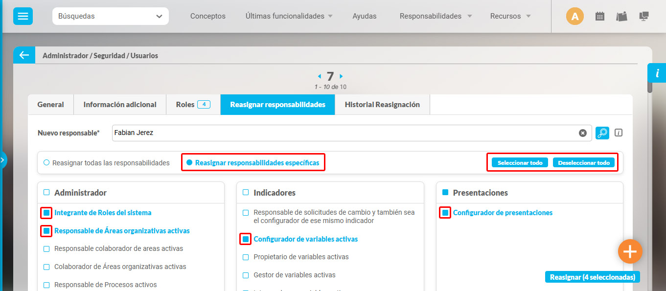 Reasignar responsabilidades específicas: Permite seleccionar y transferir únicamente las responsabilidades que se deseen reasignar de forma individual. Por ejemplo, puedes marcar los recuadros de las opciones listadas en cada módulo para elegir solo algunas. También puedes usar los botones "Seleccionar todo", para marcar todas las responsabilidades y luego desmarcar manualmente las que no deseas reasignar, o "Deseleccionar todo", para reiniciar la selección desde cero.