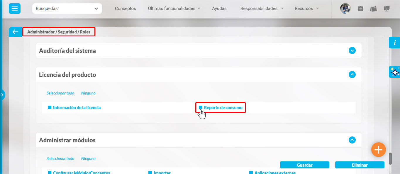Al crear o editar un rol, se debe desplegar la opción Administrador y, dentro de la sección Licencias del producto, seleccionar la opción Reporte de consumo. Una vez asignado el permiso, los usuarios asociados a ese rol podrán visualizar el reporte y realizar el seguimiento efectivo del uso y la disponibilidad de las licencias en el sistema.