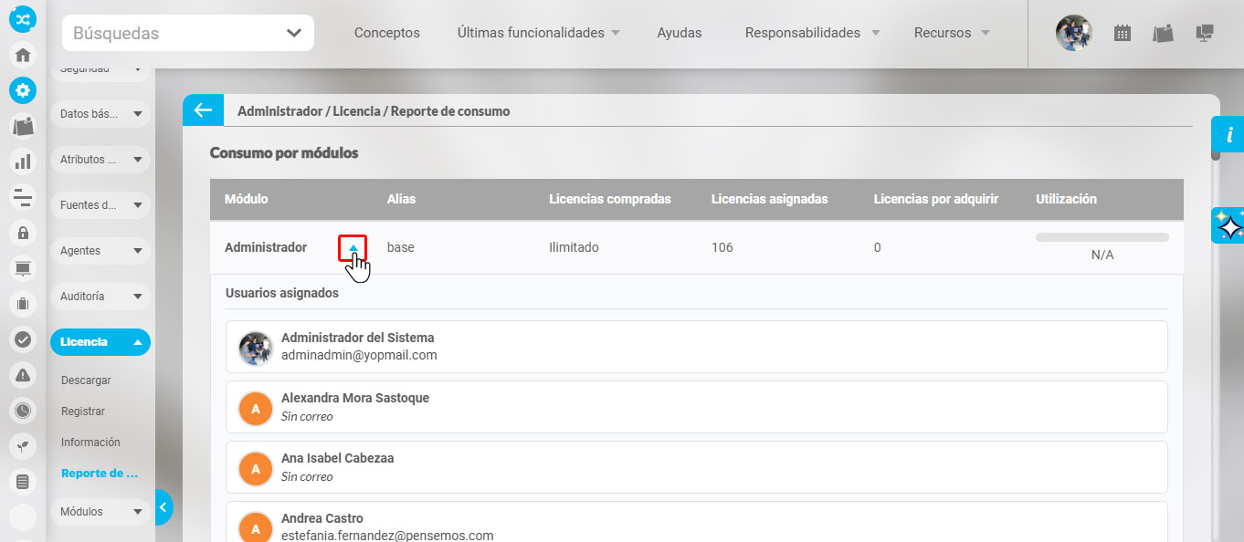 También puedes desplegar la fila haciendo clic en cualquier parte de la misma para visualizar los usuarios asignados a ese módulo, lo que permite un seguimiento más detallado del uso de licencias por usuario.