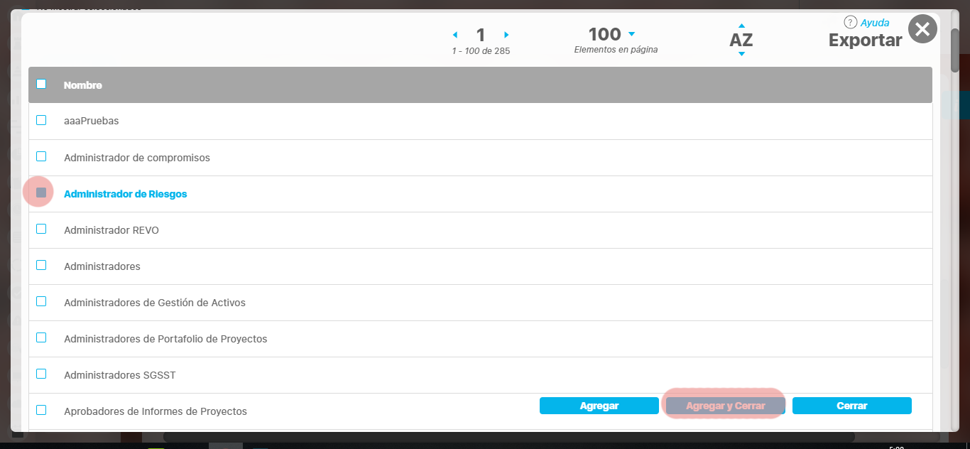 Seleccione los roles que desea asignar al usuario y elija el botón Agregar y Cerrar.
