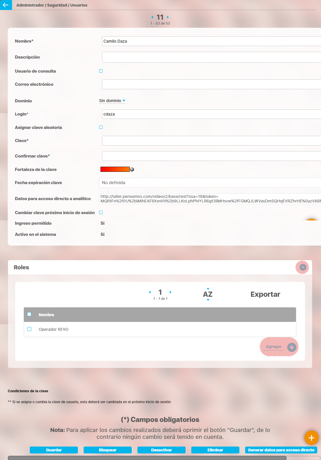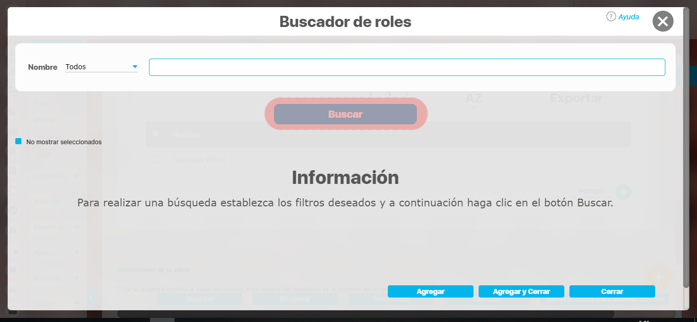 Para ello haga clic sobre el botón Agregar de la sección Roles en la pantalla para crear o editar un usuario.