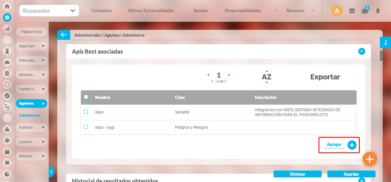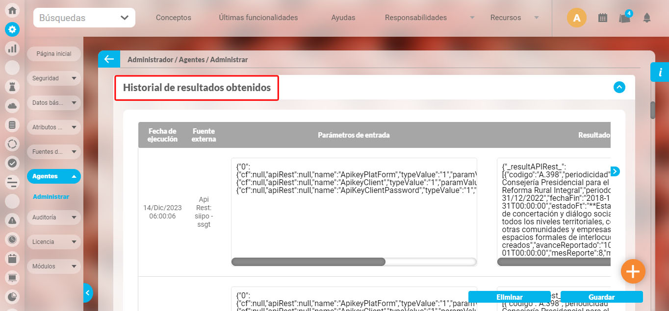 En esta sección llamada HIstorial de resultados obtenidos encontrarás todas las ejecuciones que el agente ha realizado, mostrando qué Api se ha ejecutado, cuales han sido los parámetros de entrada y cual ha sido el resultado obtenido.