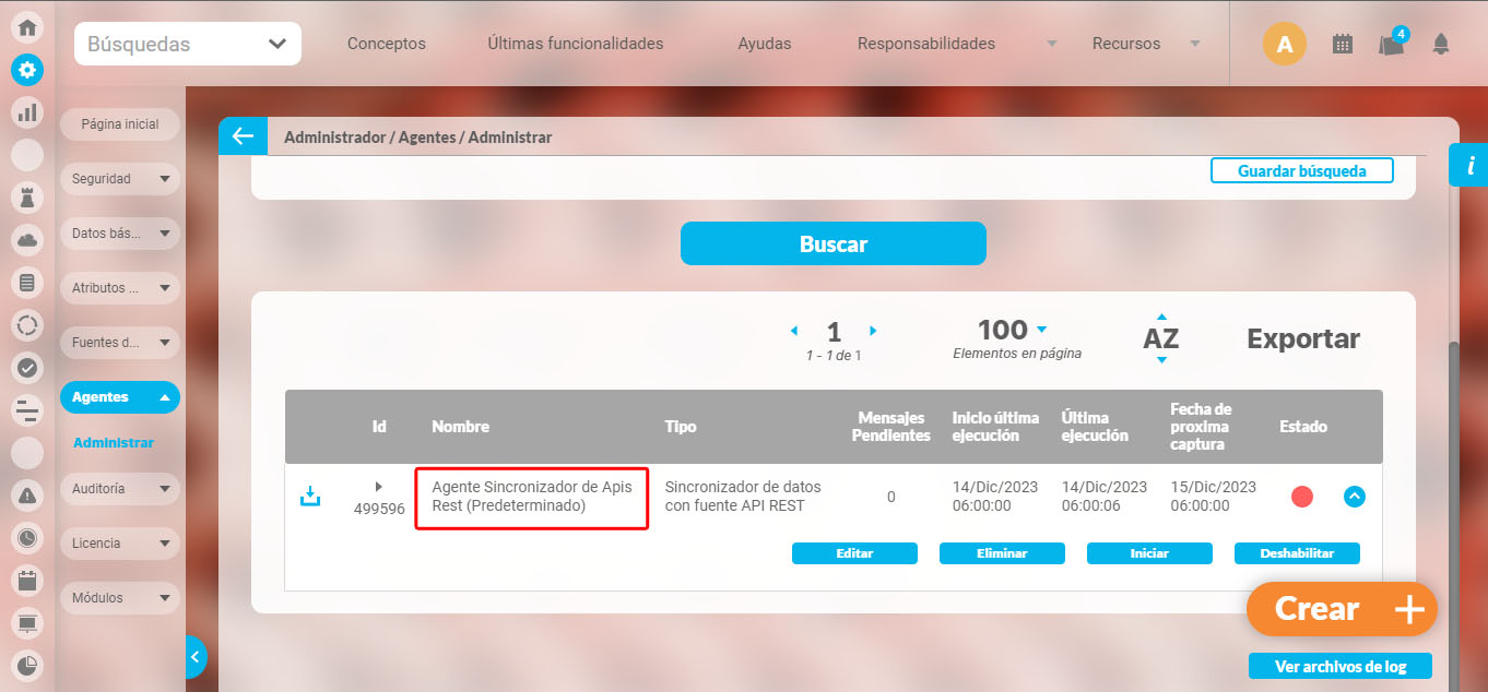 En este agente debes asociar la Api creada seleccionando el botón agregar, de esta forma cuando este se ejecute el sistema identifique a qué Api se va a conectar.